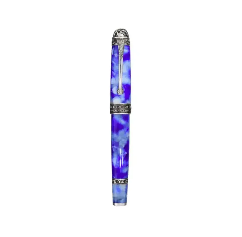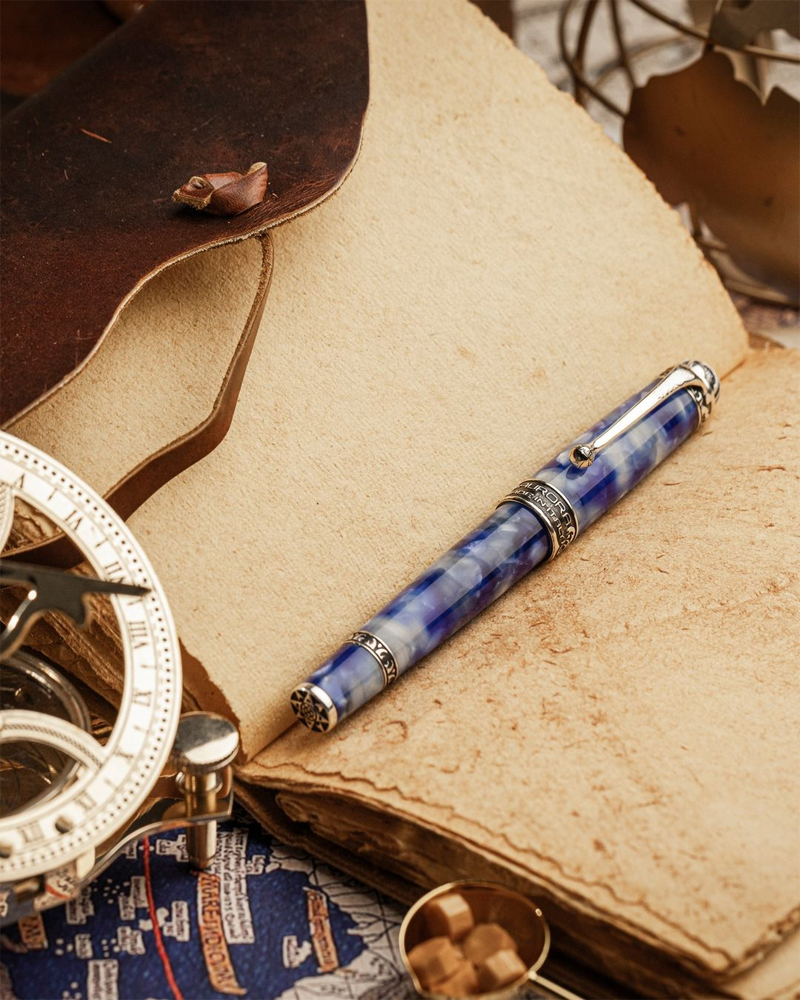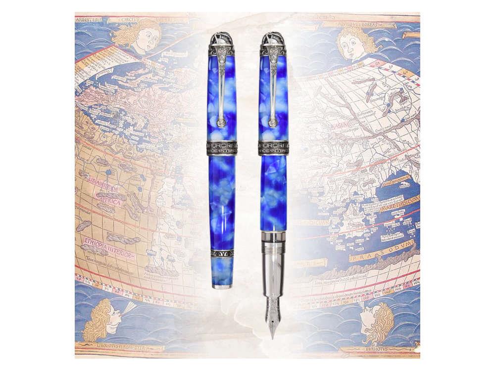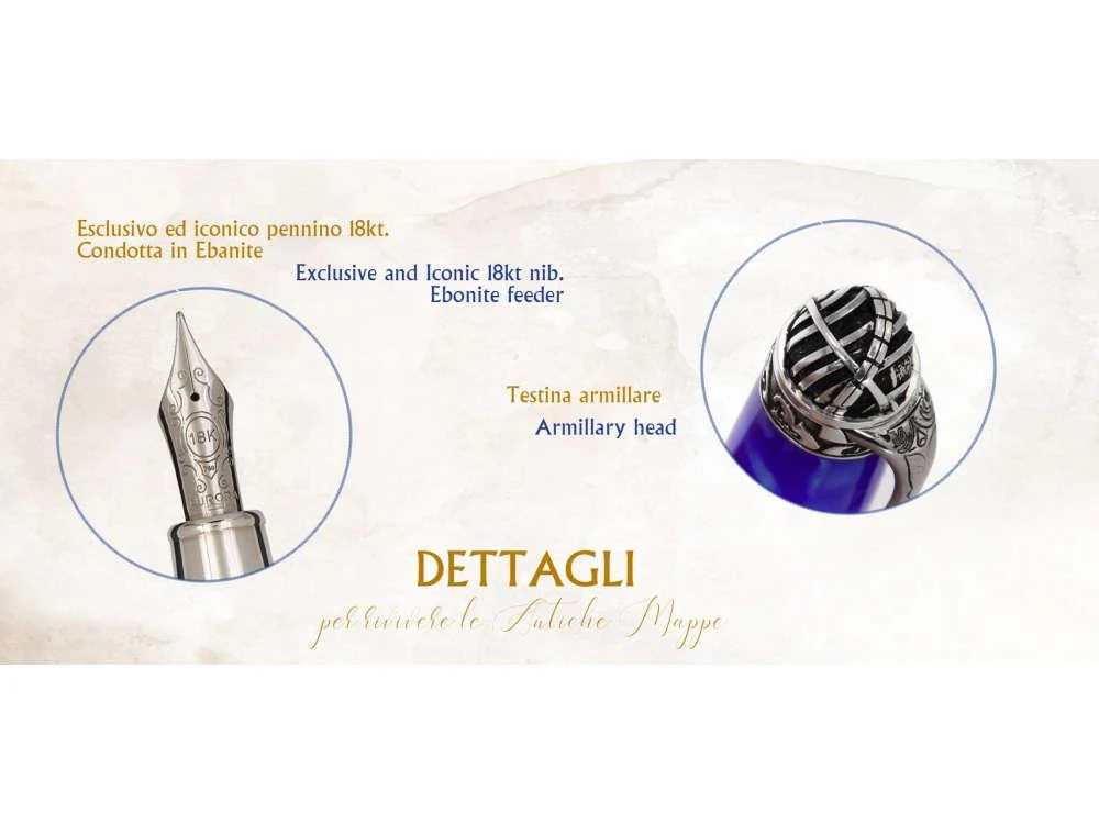 Древние карты Авроры Толомео украшены синими металлическими элементами из ауролоида, обработанными вручную и отполированными до зеркального блеска. Они оснащены пером из 18-каратного золота с эбонитовой подачей и наполняются чернилами с помощью поршневого механизма. Ограниченная серия, всего 680 экземпляров по всему миру. Голубой ауролоид и винтажная серебристая лента
