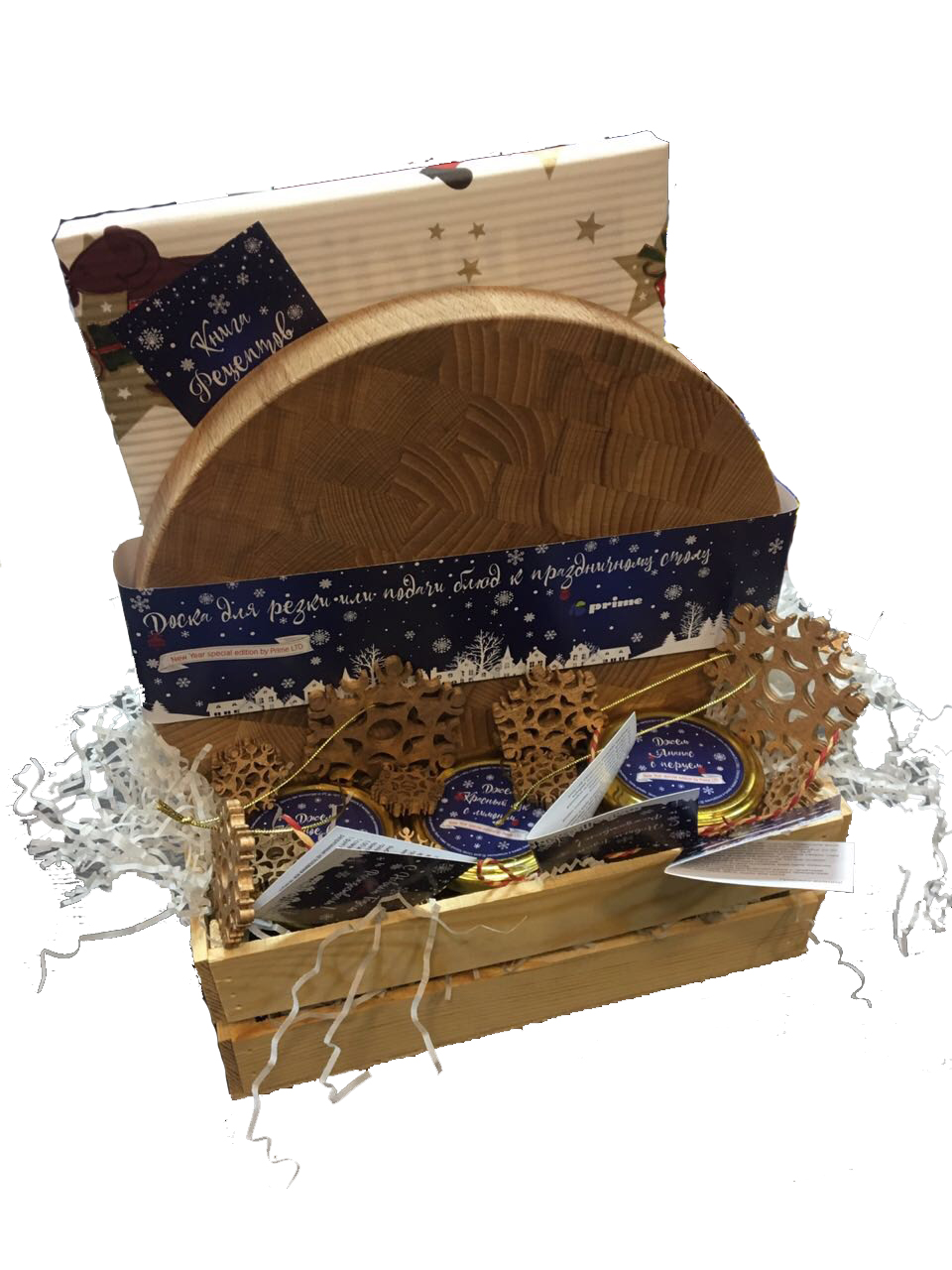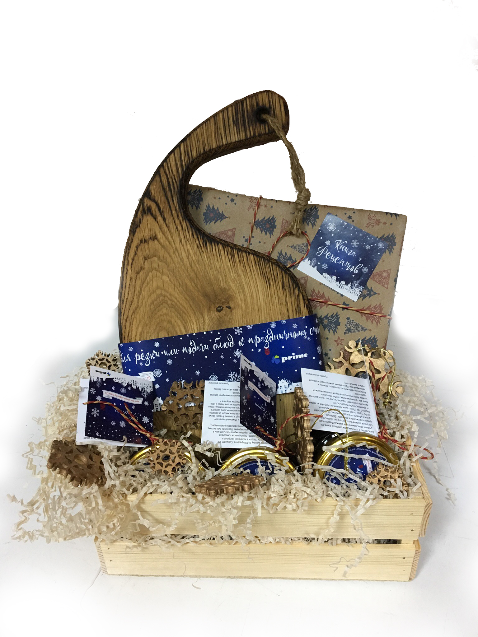-декоративный наполнитель в зависимости от повода подарка (на Новый год это елочные игрушки из дерева - снежики 5шт, на проаздники это руковица или щипцы для приготовления)